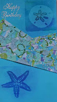 The stamp used was my beloved Stampington Lynn Perella seashore stamp, and I chalked the images. The birthday greeting was a rubber stamp by Blade Rubber Stamps, embossed in silver.